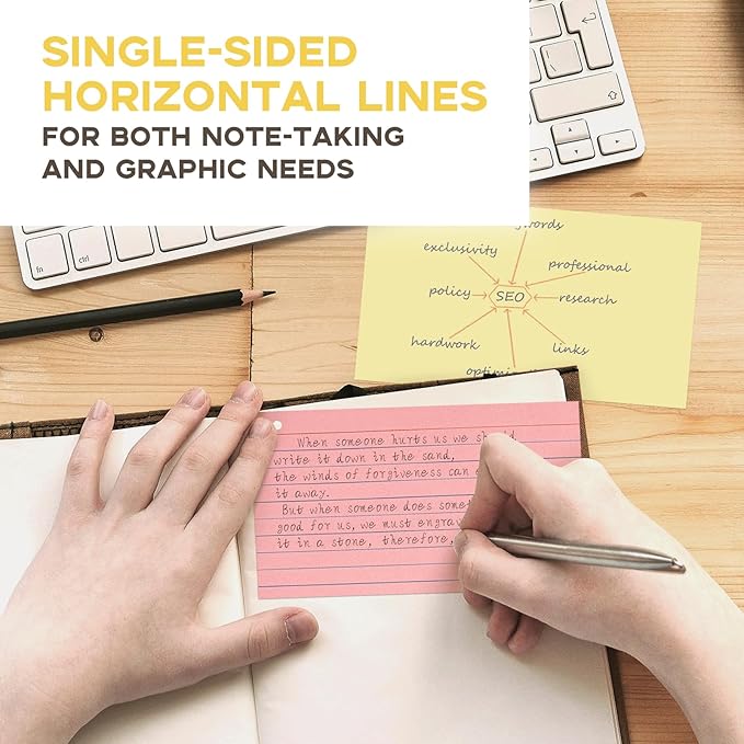 - Lined Note Cards: The clear horizontal printing and suitable spacing on these index cards colored allow for organized and easily legible writing; The smooth paper surface ensures a seamless writing experience, allowing your pen to glide effortlessly