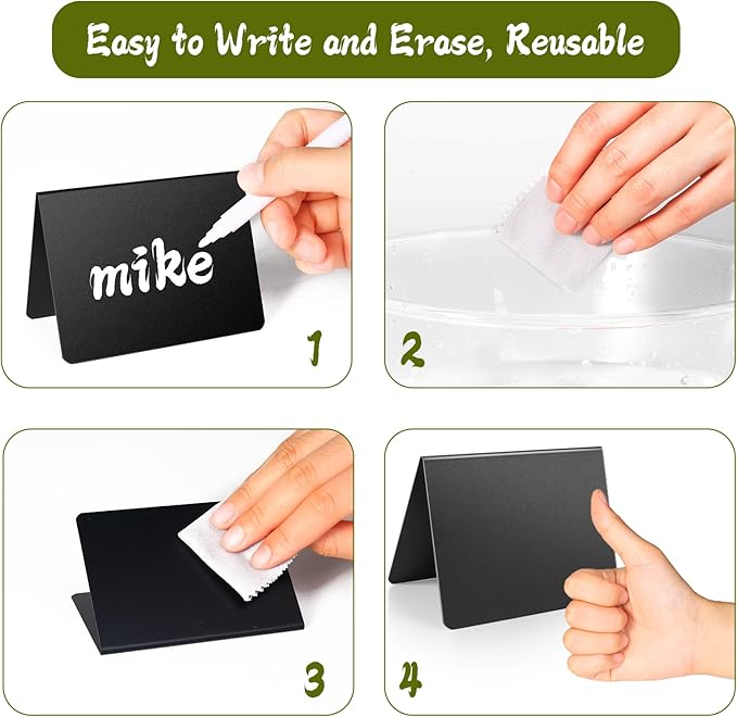- [EAST TO ERASE AND REUSABLE] Our chalkboard signs tabletop are easy to write on and erase, and they can be cleaned quickly with a rag dampened with water. If the writing on the chalk sign is left on for a longer period of time, you will need to use soapy water in order to clean it.