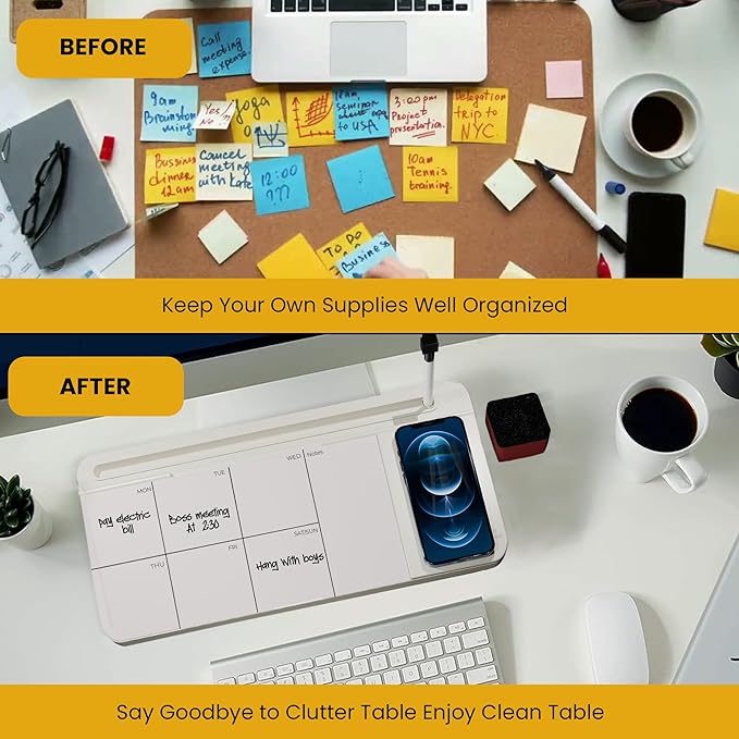 NEXTLUXE Glass Desk Whiteboard with Wireless Charger - Desktop Whiteboard with Storage, Weekly Planner, Dry Erase Pad, Organizer Drawer for Home, School, Office Gadgets – White