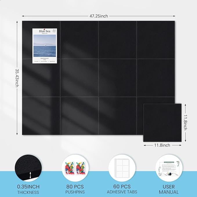 Large Cork Bulletin Board for Wall 48"x36", 12 Pack Felt Wall Tiles with 80 Pushpins, 60 Safe Removable Adhesive Tabs, Decorative Pin Board Tack Board for Office Home School, Black