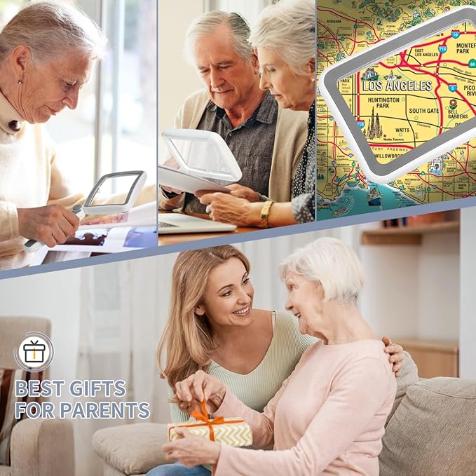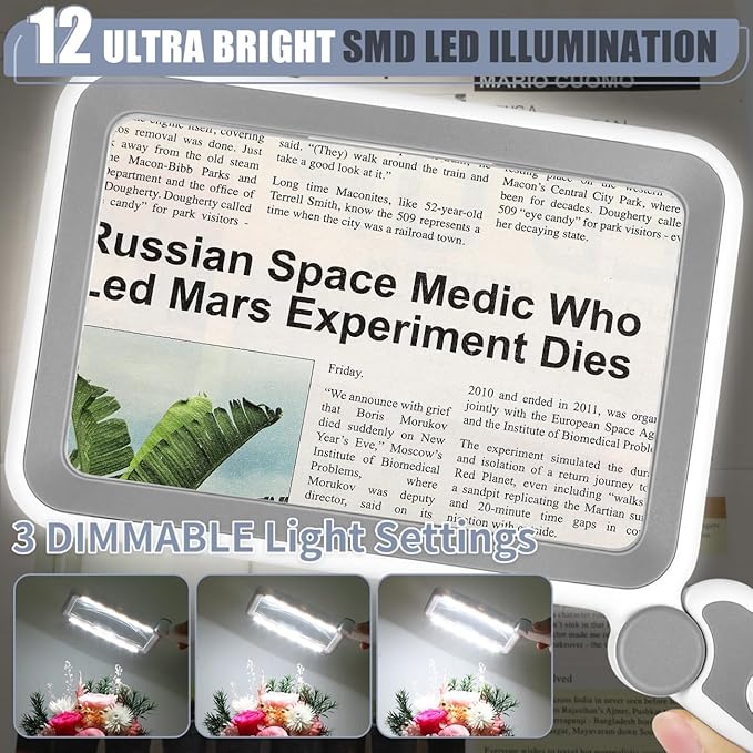 - Touch Switch & Adjustable Lighting: The full page magnifier has 12 super-bright LEDs. Easily illuminate your reading material. Simply touch the on/off switch on the magnifier handle to set the desired brightness easily. The LEDs provide bright, even light to ensure every detail is visible, reducing eye fatigue and improving the overall viewing experience. A perfect aid for seniors suffering from ageing eyes and macular degeneration.