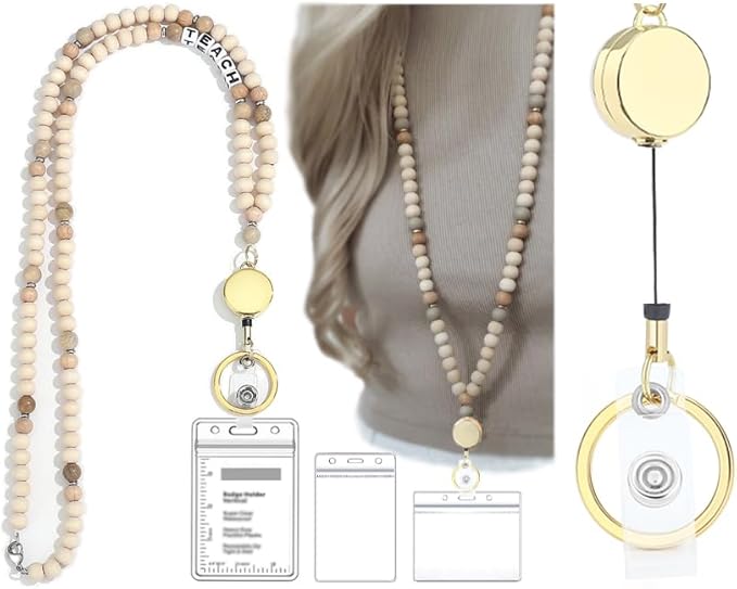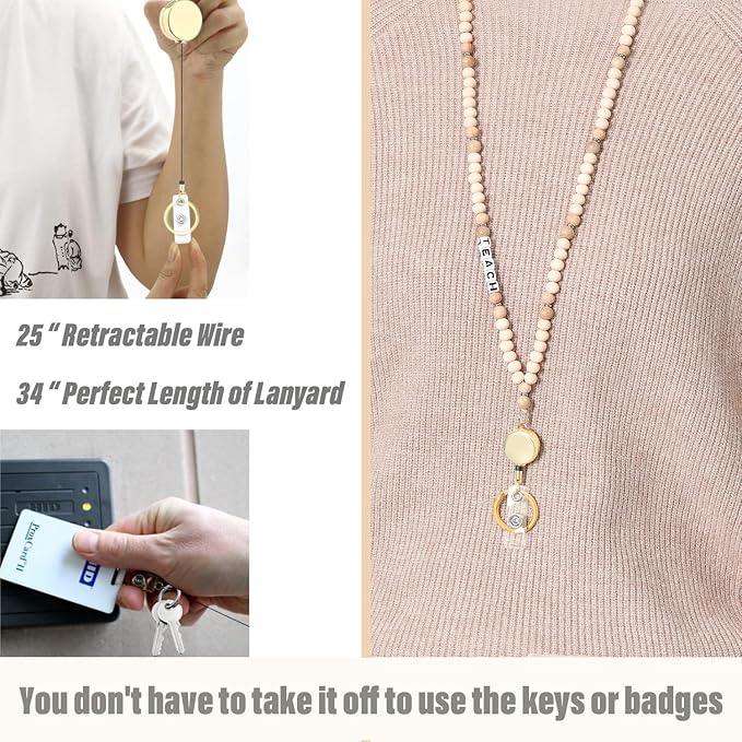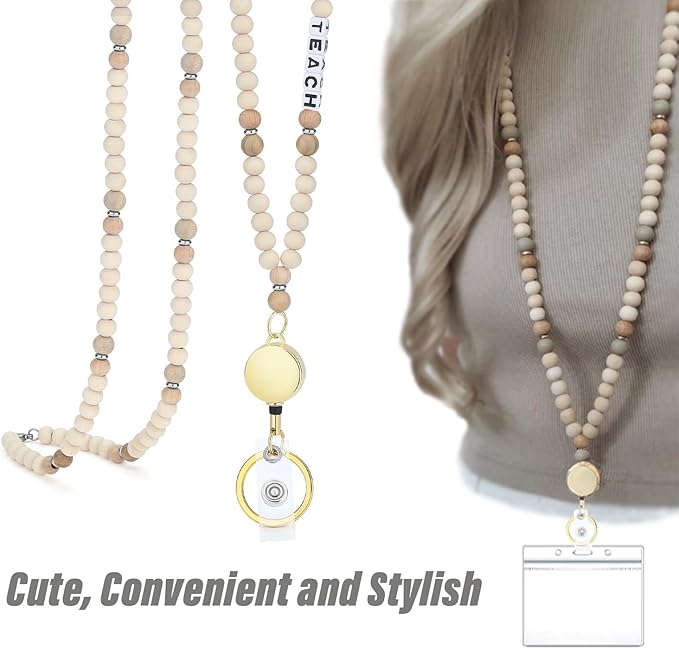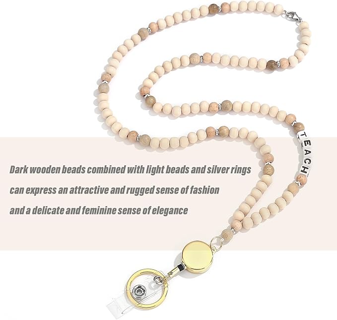 - Stylish Retractable Teacher Lanyard for ID Badges - Natural wooden bead lanyards for ID badges. Retractable, stylish and cute. Great as teacher lanyard, teacher lanyards for keys, teacher lanyards for ID badges, lanyards for id badges holder, cute keychain lanyard for women.