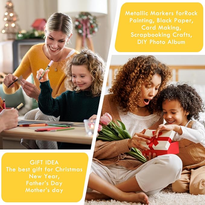 - Safe & Acid-Free - Metallic artist markers are made with water-based, opaque metallic ink. No Shaking Or Pumping Needed To Get The Marker Started Uncap And Write, Safe and acid-free metallic markers for kids and adults. Gift for family, Best gift for Children.