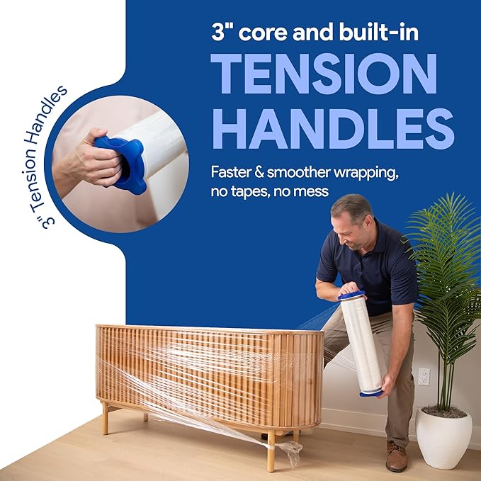 - CONQUER MOVING DAY: Wrap, bundle, and secure all your belongings with ease using this 18" x 1200 ft 80 gauge stretch film with 3" core and Tension Handles. Move with confidence knowing your items are protected!