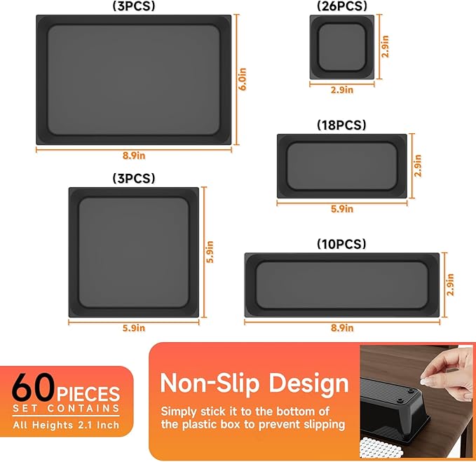 - Diversified Dimensions: The 60 Pack plastic drawer organizer set includes 5 different sizes, including 3 "x3 "(26pcs), 6 "x3 "(18 pcs), 9 "x3 "(10 pcs), 9 "x6 "(3 pcs), 6 "x6 "(3 pcs),You can customize the combination to customize your own drawers