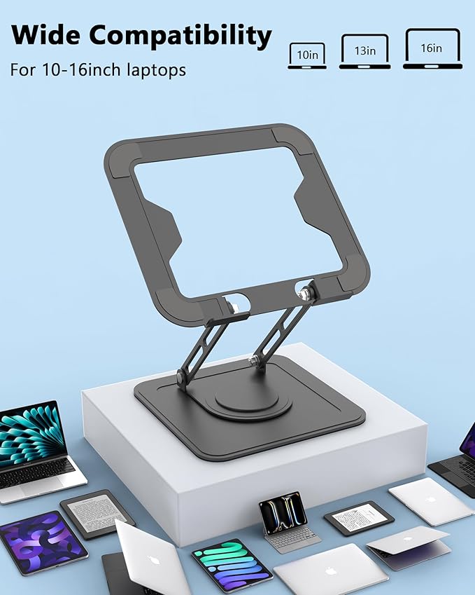 - ✔️[Stable & Durable] - The Computer stand is made of one-piece fiber metal material, which is more durable and stable than ordinary aluminum alloy computer stands. The upgraded rotating base makes the stand performance more stable, and the non-slip silicone protects the laptop from sliding.