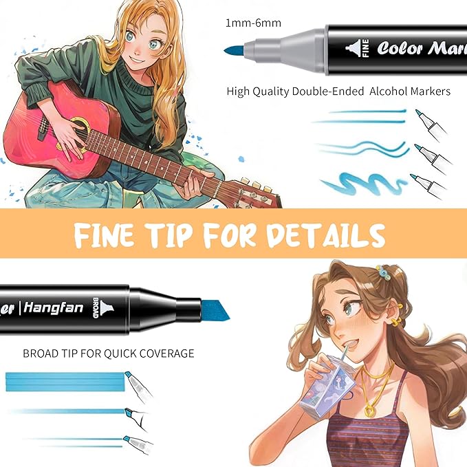 - ✨【FIND COLORS FAST:】Our Alcohol Based Broad&Fine Point Markers are coded at both ends of pen caps so you can quickly find the color. Hangfan Coloring Art Markers is perfect for fashion design, animal photo, landscape design, illustration painting, achitectural design and figure painting.