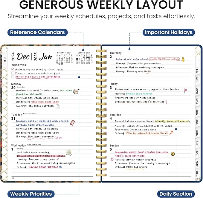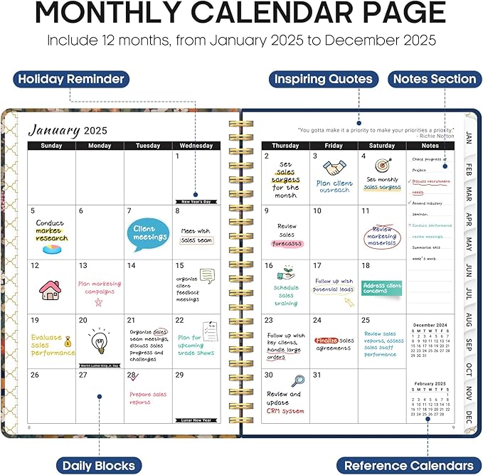 - Monthly Overview: Stay ahead with spacious daily blocks and clear holiday reminders on every monthly spread. The inclusion of past and future reference calendars ensures seamless long-term planning, so nothing slips through the cracks.