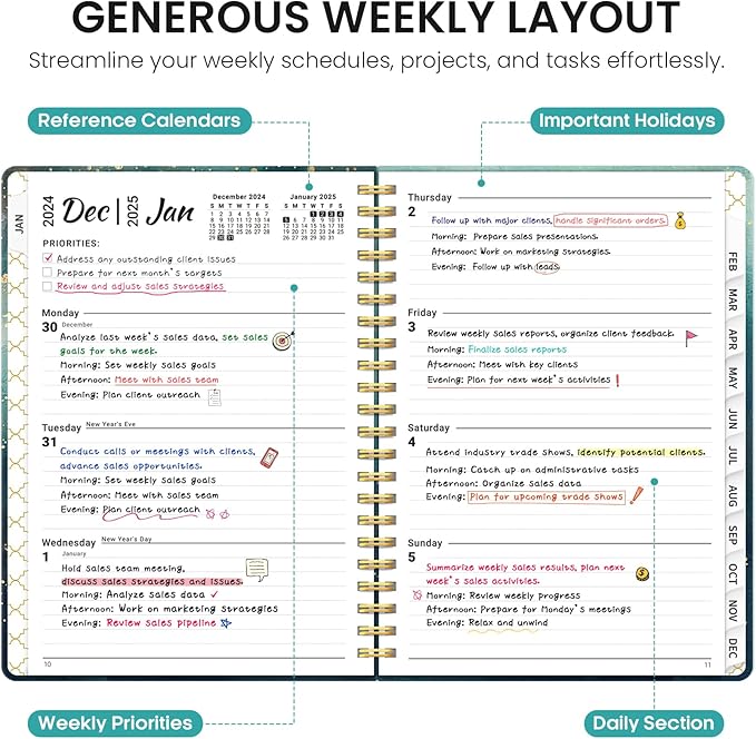 - Weekly Focus: Achieve your weekly goals with ease. The weekly pages provide generous space for appointments, events, and to-do lists, while checkboxes help you track and celebrate progress as you move through the week.