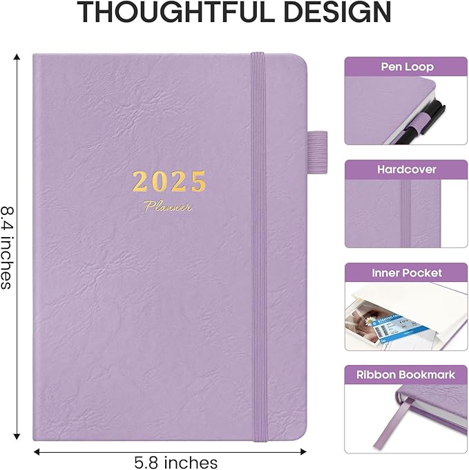 - Premium High Quality: Made with high-quality thick paper for a smooth writing experience, this 2025 planner boasts a sturdy hardcover, an elastic band, and a bookmark for added convenience. The A5 size (5.8" x 8.4") is perfectly portable, with a back pocket for extra storage, making it ideal for easy planning.