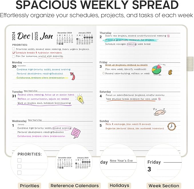 - Premium High Quality: Made with high-quality thick paper for a smooth writing experience, this 2025 planner boasts a sturdy hardcover, an elastic band, and a bookmark for added convenience. The A5 size (5.8" x 8.4") is perfectly portable, with a back pocket for extra storage, making it ideal for easy planning.
