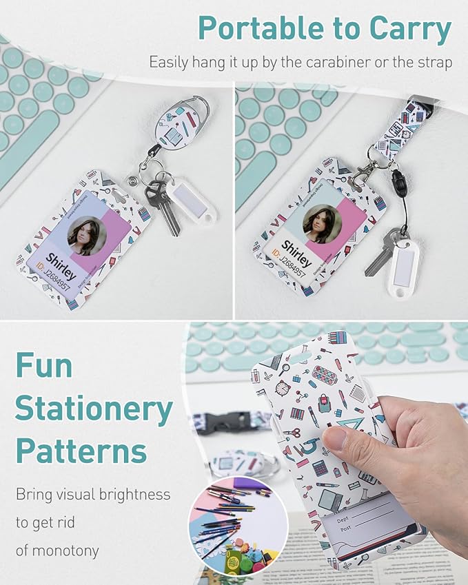 Uniclife Fashionable Sliding Badge Holder Stationery Pattern Plastic Case with Retractable Badge Reel Carabiner Clip & Detachable Lanyard Strap Vertical Card Protector for Women Nurse Teacher Student