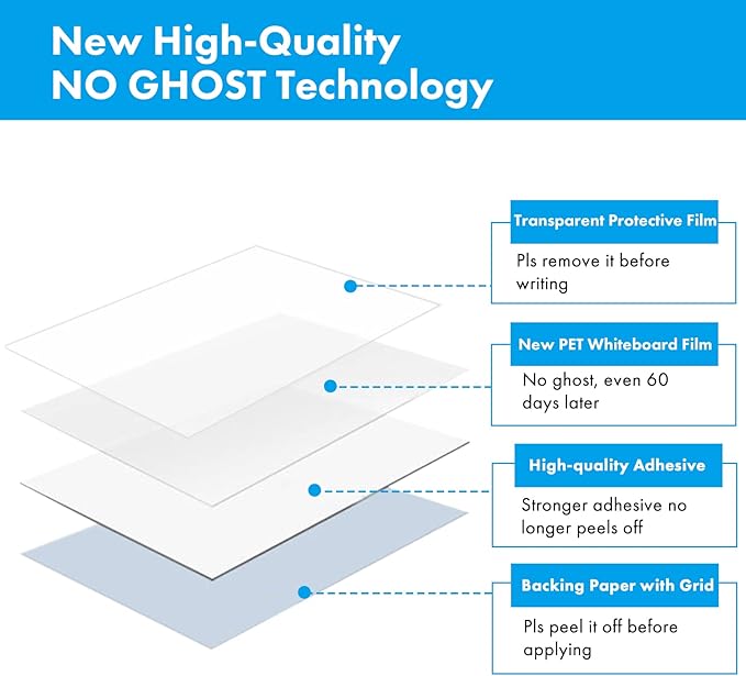 - NO GHOST – The product has been upgraded and is currently a high-quality whiteboard. Even if leave drawings on it for a month, they still erase with ease. NOTE: pls REMOVE the TRANSPARENT PROTECTIVE FILM on the whiteboard before writing.