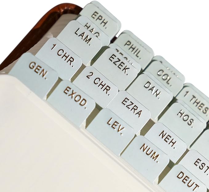 • Easy Installation: Tabs come with directions and a tab guide for perfect placement in your Bible; Each tab is pre-cut and self-adhesive so simply peel, align in your Bible, and stick!