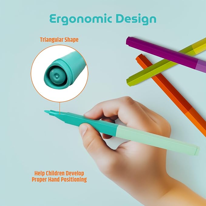 - Ergonomic Design: The triangular shape of the marker is crafted to fit naturally in a child's hand, allowing the thumb, index finger, and middle finger to comfortably surround it. This design promotes a stable grip, helping children develop proper hand positioning and control while drawing or writing. Additionally, the triangular shape of these markers prevents them from rolling off your table or desk as you work!