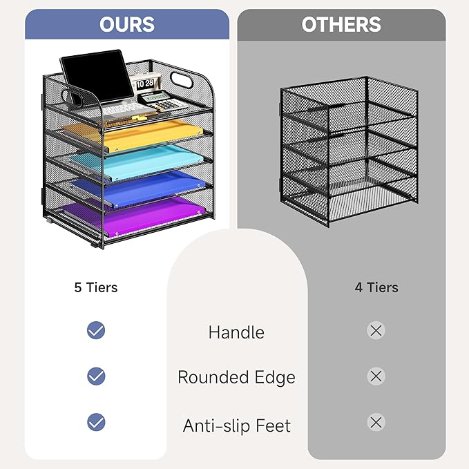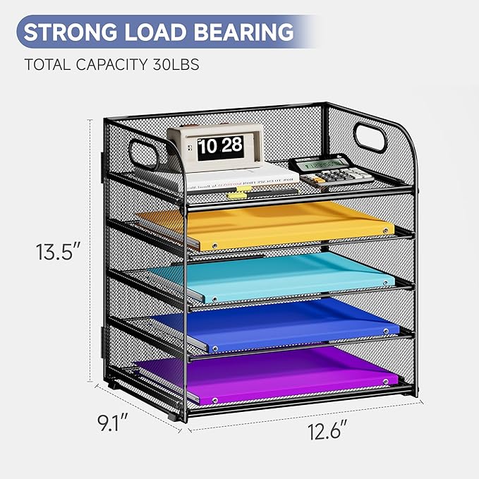 - 【EFFICIENT DESK ORGANIZER】Keep your desk tidy and clutter-free with our 5-Tier Paper Organizer with Handle. This file organizer provides ample space for sorting and storing papers, letters, documents, folders, books, magzines, staplers, caculators and sticky notes.