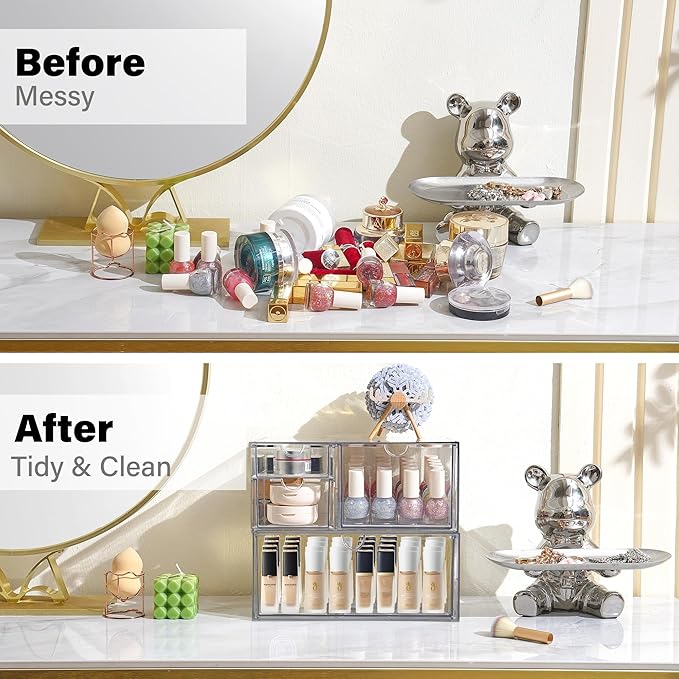 - Unique Design: The acrylic makeup organizer drawer allows for easy identification of contents. Made from durable, unbreakable plastic, they are equipped with silicone anti-slip pads on the bottom to prevent movement when the drawer organizer storage is opened or closed, ensuring a steady and reliable storage solution.