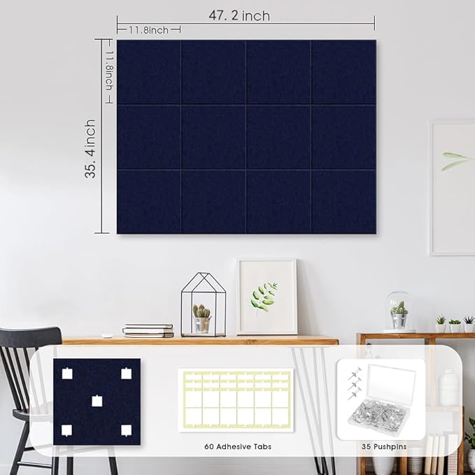 Large Cork Board for Office Wall Decor,48"x36"-12 Pack Felt Wall Tiles with 35 Push Pins, Thicker 0.47in, Felt Bulletin Board Pin Board Cork Boards for Walls - Dark Blue