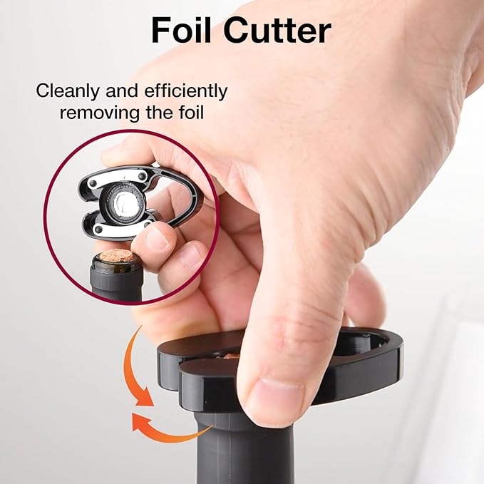 - Versatile Wine Tools Included:Our Wine Stopper prevents oxidation by removing air from the bottle, preserving the wine’s original aroma and flavor. The Wine Pourer aerates the wine as you pour, enhancing the tasting experience. The Foil Cutter smoothly removes the wine cap seal for easy access. The compact storage base saves space and keeps your wine tools organized when not in use.