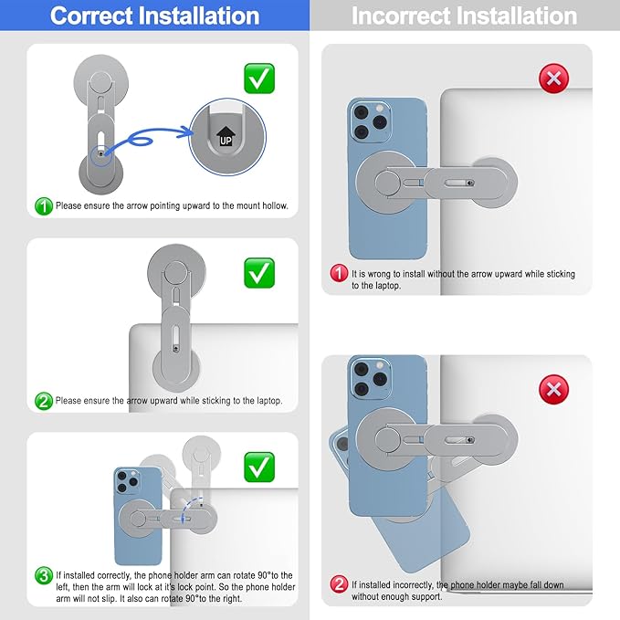 - What's in The Box: 1 x Laptop Phone Holder, 1 x Alignment Card for Phone, 1 x 3M Tape, 1 x Magnetic Ring, 1 x Gift Box. Correct Installation: Please keep the arrow upwards while installing. Please waiting 5 minutes before using