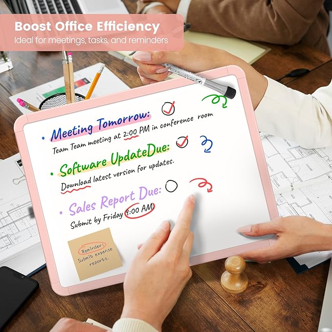 - Double-Sided Design, Double the Space: Unlike other small whiteboards, our double-sided whiteboard offers twice the writing area, making it ideal for organizing schedules, jotting down ideas, and managing multiple projects. It's the perfect family organizer and office whiteboard, enhancing productivity and creativity.
