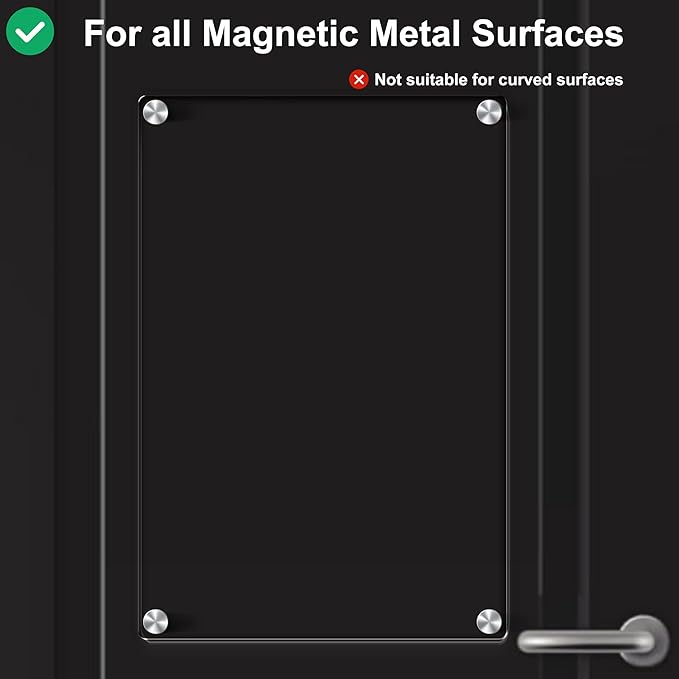 - [Easy to Write, Easy to Read, Easy to Erase] Our 12"x8" magnetic board for fridge is made of clear acrylic, not easy to scratch and break. The acrylic white board surface is easy to clean and erase, you just use cloth with water for complete cleaning. Your acrylic dry erase board without leaving any stains or ghosting.