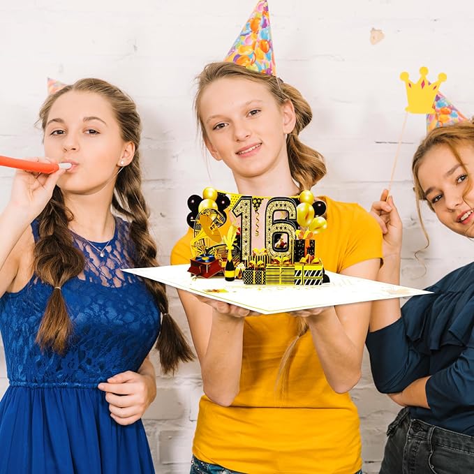 - 16th Birthday Pop Up Card: This cute 16th birthday pop up card is mini-masterpiece displays a beautiful 3D pop-up design.It can be popped up of features “16” with balloons and gift box. Ideal Creative Gifts for party. Makes your birthday or anniversary party’s decorations stand out