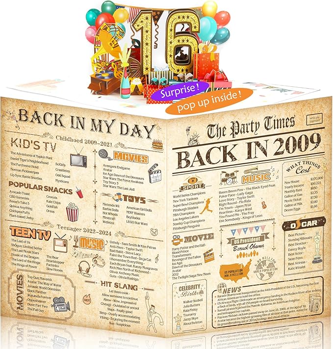 16th Birthday Card for Girls Boys, 3D Pop Up 16th Birthday Gifts Cards, Happy 16 Birthdays Decorations for 16 Year Old Son Daughter, Funny Back In 2009, Classy Vintage