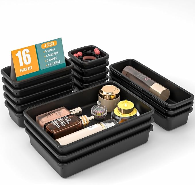 16 PCS Drawer Organizer Set, 4 Size Makeup Drawer Divider Organizer With Non-Slip Pads, Interlocking Plastic Storage Bins for Office,Jewelry Vanity,Gadgets, Bathroom,Kitchen, Black
