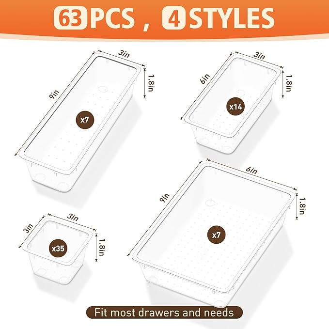 - Ultimate Storage Solution: 63-piece set of clear drawer organizer bins, featuring four sizes (3x3 inches, 6x3 inches, 9x3 inches, 9x6 inches) of drawer organizers, is the ideal choice for achieving perfect organization and storage in your bathroom, kitchen, office