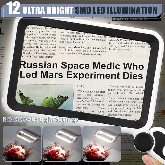 - Touch Switch & Adjustable Lighting: The full page magnifier has 12 super-bright LEDs. Easily illuminate your reading material. Simply touch the on/off switch on the magnifier handle to set the desired brightness easily. The LEDs provide bright, even light to ensure every detail is visible, reducing eye fatigue and improving the overall viewing experience. A perfect aid for seniors suffering from ageing eyes and macular degeneration.