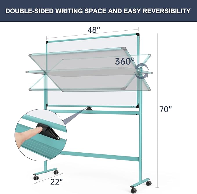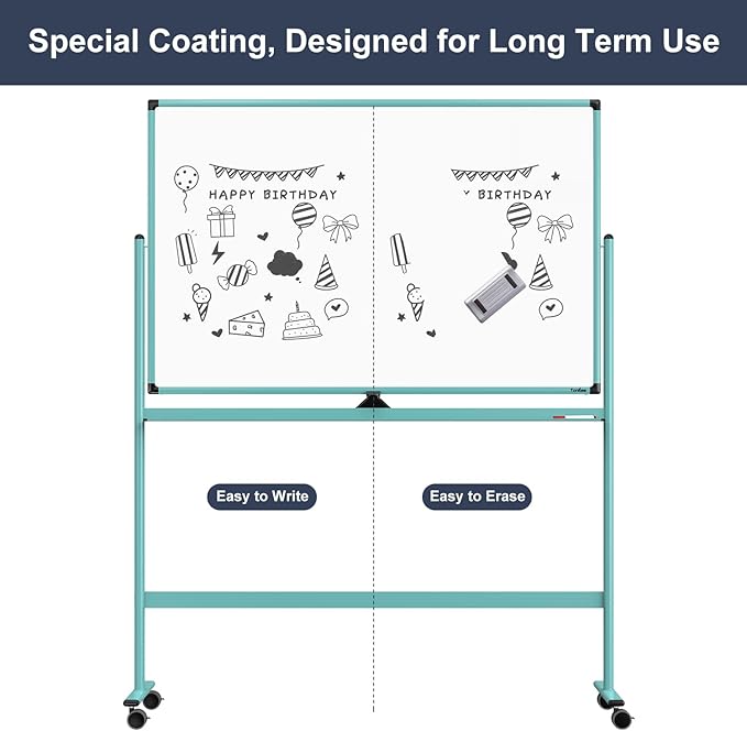 - DOUBLE-SIDED DESIGN - The double-sided whiteboard gives you plenty of writing space, while the board stopper ensures that the mobile whiteboard stays firmly in place during use, preventing it from moving or wobbling.
