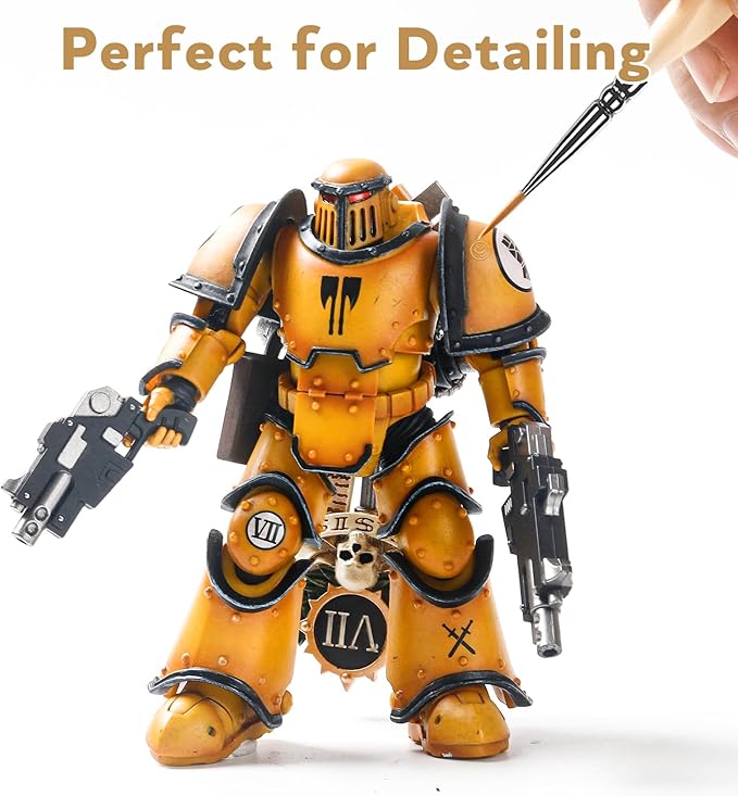 - Beautiful Design: Fine detail paint brush set contains super fine tip round, liner, flat, and spot brushes. What that means to you is an entire paint set devoted specifically to miniatures and detail painting. The pointed spot can be painted on a narrow angle based on ergonomics and can be painted accurately.