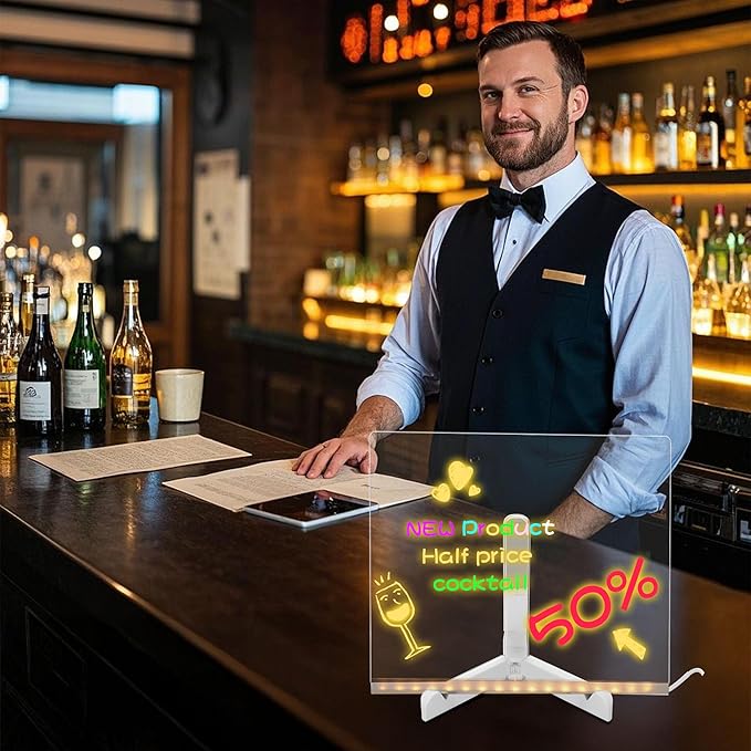 - Extremely Attractive: LED acrylic message board is made of transparent acrylic with a traceless and crystal clear surface. The LED note board base is embedded with a bright LED strip. With just a USB connection to a 5V1A power supply, you can see the drawing board LED lights cast a bright and romantic glow on the acrylic surface, adding warmth and beauty to your writing and drawing messages and creating a captivating neon effect that ensures they grab attention immediately